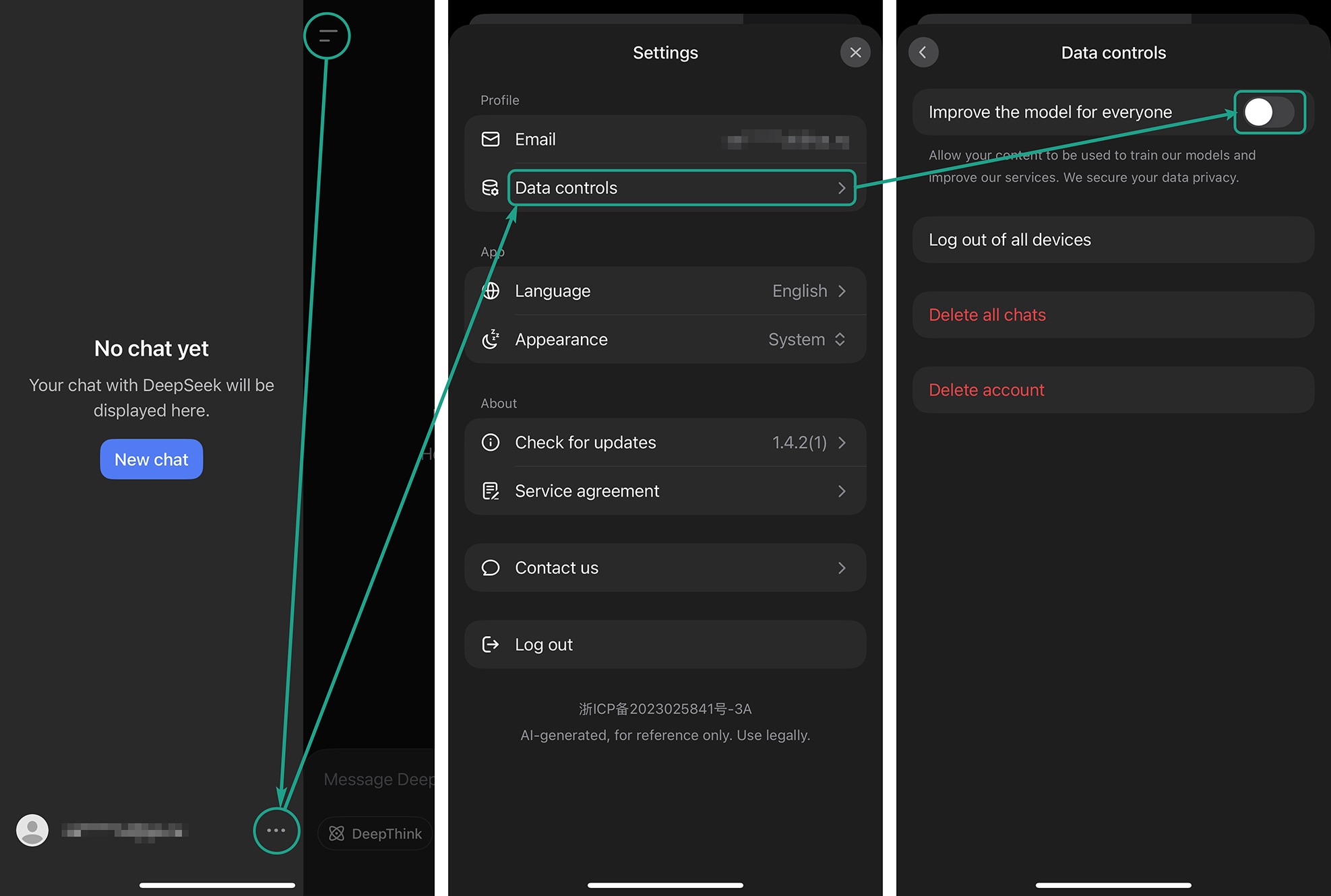 In the DeepSeek mobile app, you also open the left sidebar, click the three dots next to your name at the bottom, and reveal the Settings menu. In the menu, open the Data controls section and turn off Improve the model for everyone.