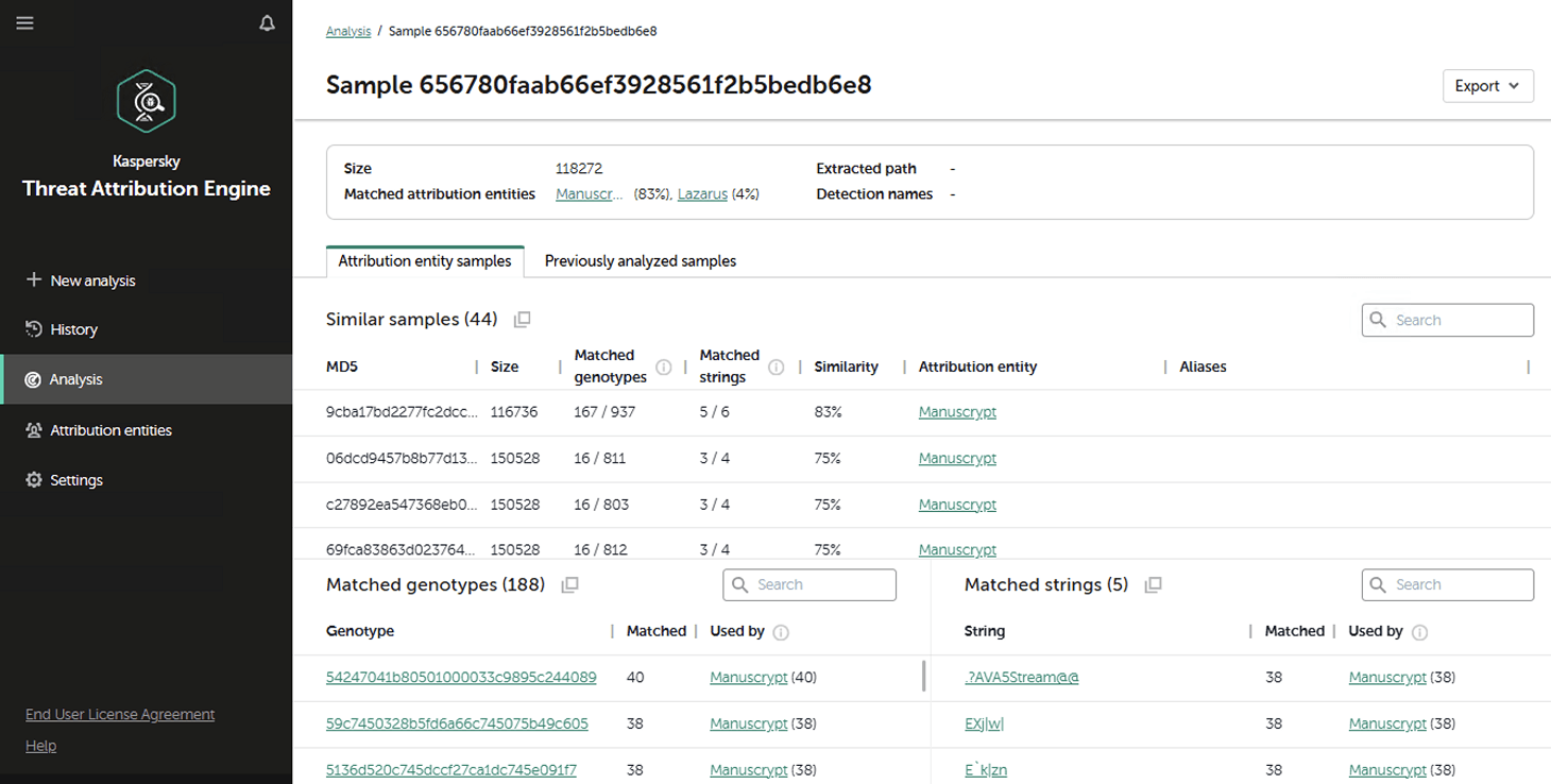 Additionally, the on-prem version of KTAE gives experts the ability to add new threat groups to the database and link them to malware samples they discovered on their own. This means that subsequent attribution of new files will account for the data added by internal researchers. This allows experts to catalog their own unique malware clusters, work with them, and identify similarities.