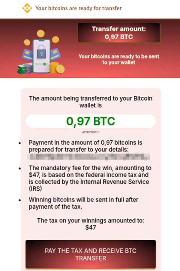 Here’s a survey page containing a scam message and link. The visible portion features a well-known crypto exchange logo and an active link to the attackers’ site. At the bottom, you’ll notice a couple of dots — more on these later