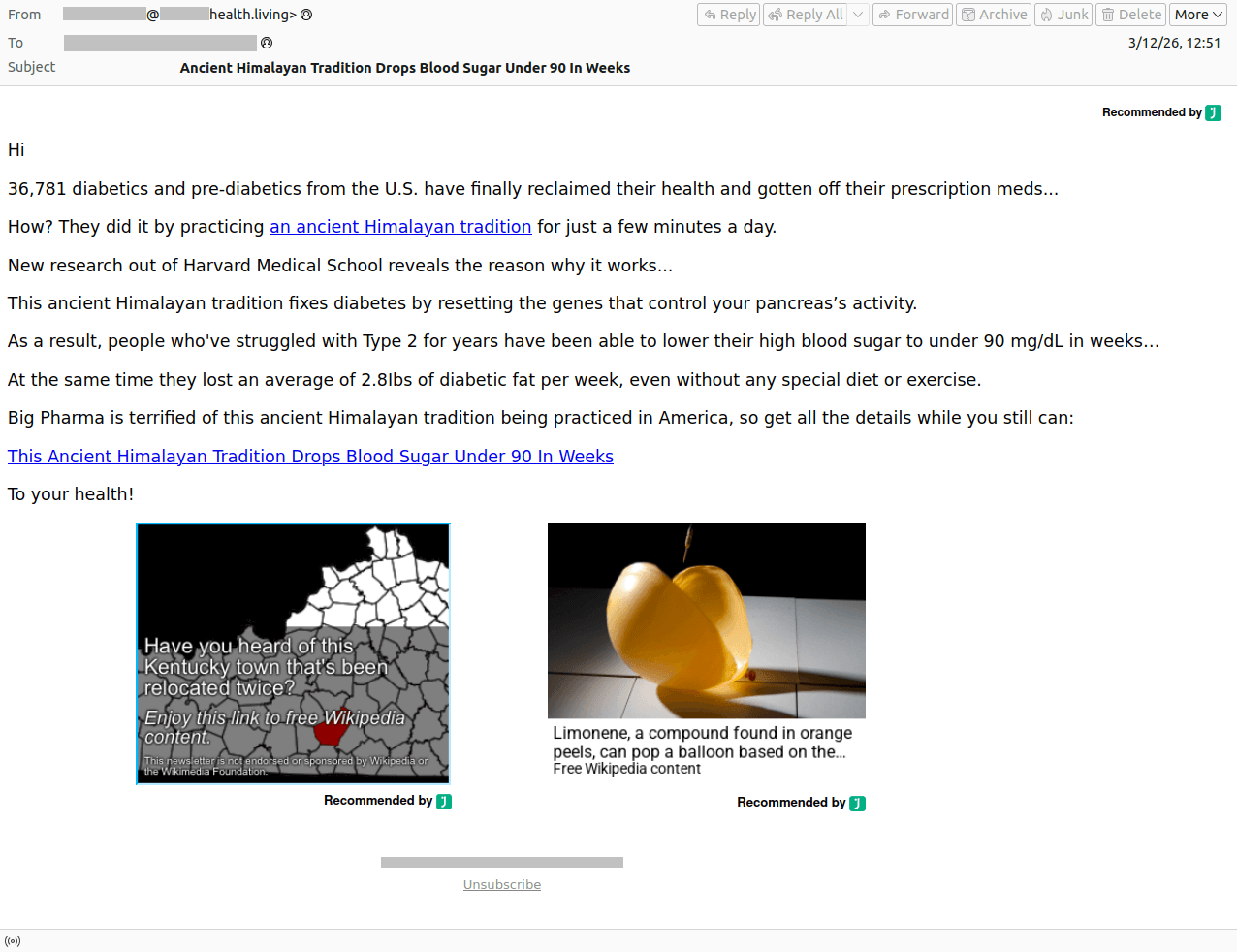Hackers aren’t the only ones interested in the medical field — spammers and scammers are all over it, too. They pitch “medical services” with deals that look way too good to be true, send out emails about supposed changes to your health insurance, or talk up “ancient Himalayan healing traditions”. Of course, all the links they send lead to suspicious websites offering dubious goods or services.